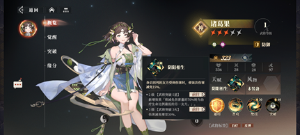 诸葛果作为神将虽然有保护后排的天赋,但是绝技只能治疗自己,突破技全体驱散控制,现在没多少武将有控制,更别说全体控制,即使有,前期战斗节奏快,诸葛果很难左右PVP战局。单卡不够强度也不够万金油,反伤又还没有相应体系构筑,不建议玩家开荒阶段专门养成。
