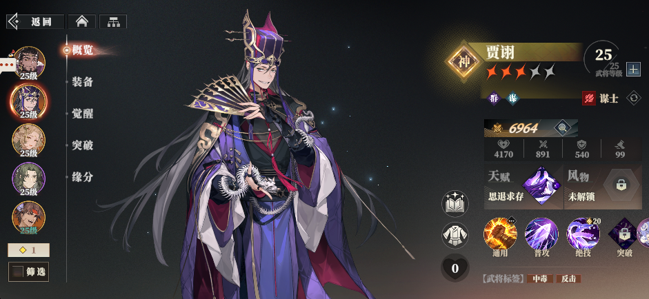 通过血量来上毒状态,是主要的作用是辅助李儒,有一定的免伤站场能力,后期坦度上来,可以考虑放置到前排卖血挂毒。