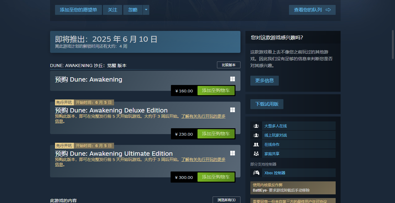 沙丘觉醒Dune:Awakening已经在steam官方平台公布6.10号正式上线