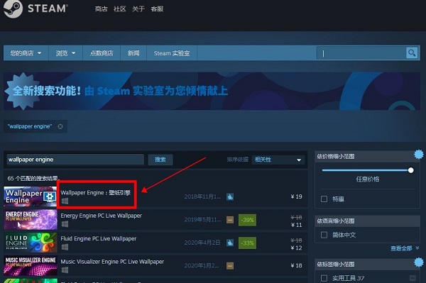 1、首先下载steam软件,然后在上面搜索Wallpaper Engine。