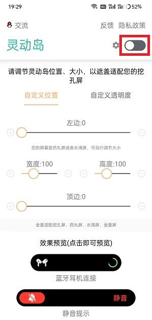 5、设置好权限之后开启灵动岛,就可以使用了,刚开始的灵动岛默认左边,可以根据自己需要进行调整。