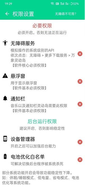 3、未获得权限前需要设置必要权限开启,否则会影响运行,跳到权限设置之后,点击开启对应权限。
