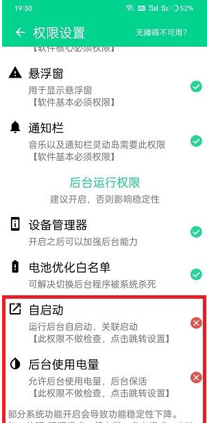 ps:自启动、后台使用电量如果无法正常开启,先退出软件,等待一两分钟之后打开,重复步骤2可正常使用。