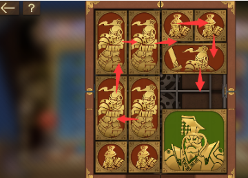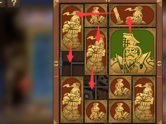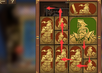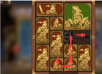 1、先将左上角的长方形向下移动其旁边的长方形也向下移动,正方形向左移动,右上角的长方形向左移动,将军向上移动。