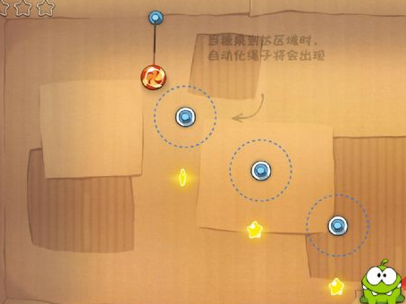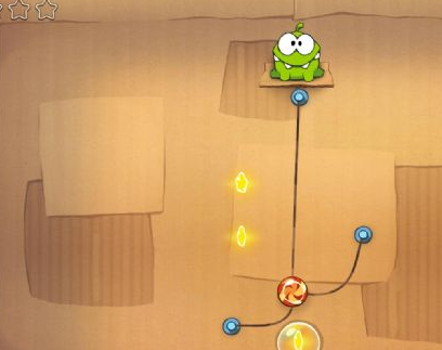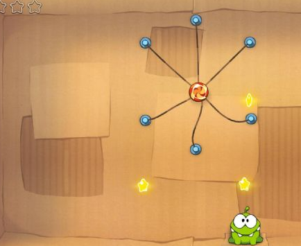 割断上放绳子,使糖果进入气泡,然后糖果升至最高处收集星星后破裂即可。