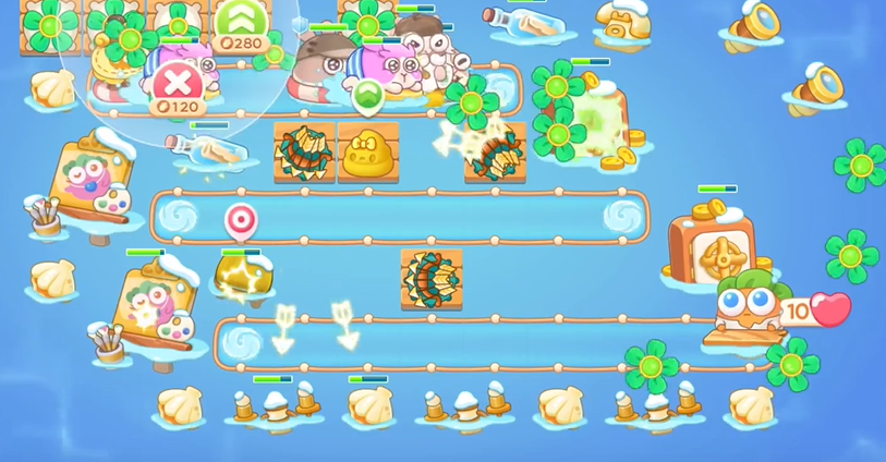 1、我们这一关只需要三种防御塔即可过关,并且必给风扇,我们只要刷出便便和弓箭即可。