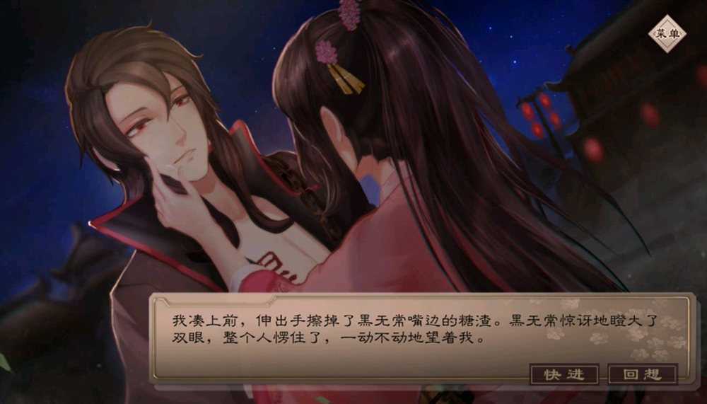 女主伸出手擦掉了范无救嘴边的糖渣,他惊讶地瞪大了双眼。