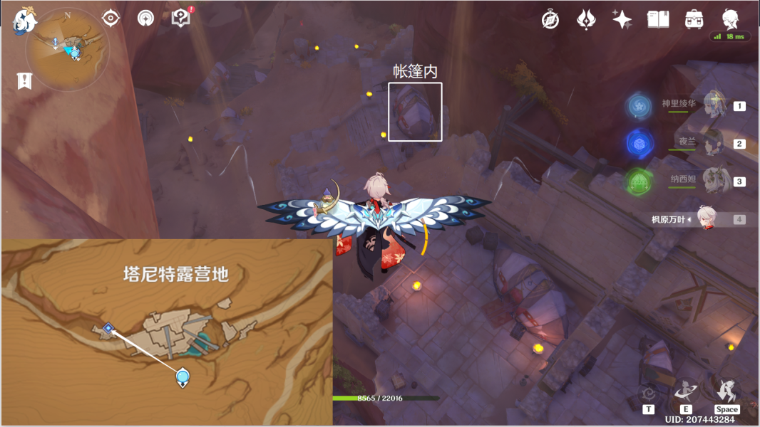 3、传回神像,往地图东北方,向下飞,去到帐篷门口。
