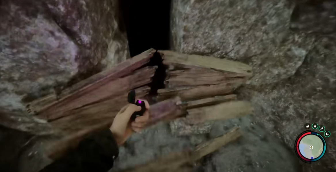 5、向里探索,在深处会有水潭,岸边有很多东西,潜水服就在箭头所指位置。
