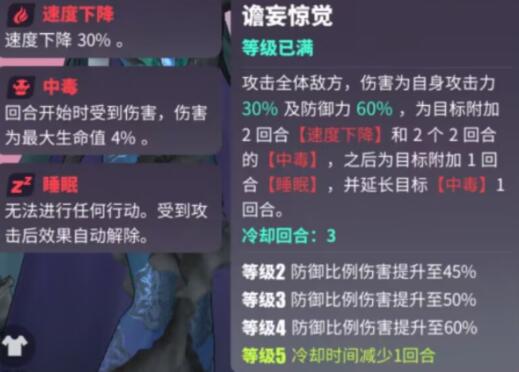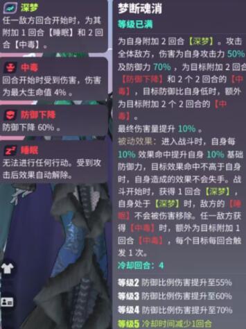 2、二技能搭配上一技能使用非常适合于pve作战要求,效果为睡眠与中毒。
