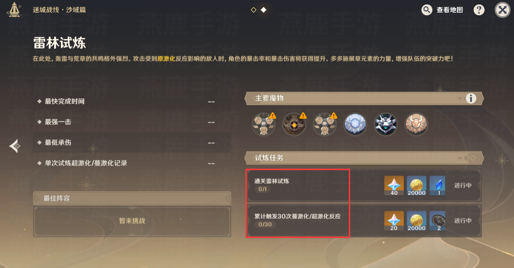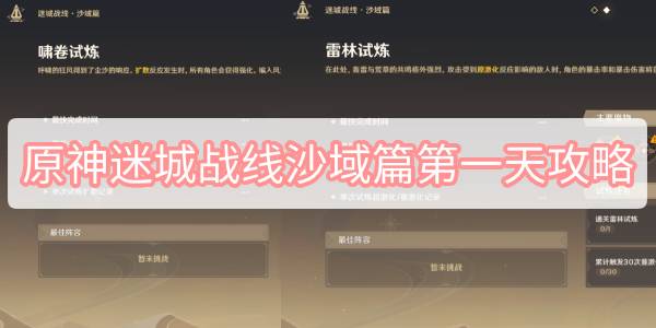 在原神的3.3版本中开放了活动迷城战线的沙域篇挑战,第一天开了两个关卡。分别叫做[啸卷试炼]和[雷林试炼],有的玩家不知道怎么过关。今天小编为各位玩家带来了原神迷城战线沙域篇第一天攻略,有需要这个攻略的玩家快来看看吧。