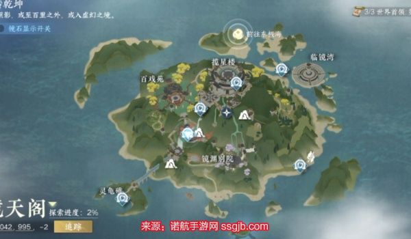 1、首先先去往镜天阁,坐标为【1407,1102】;