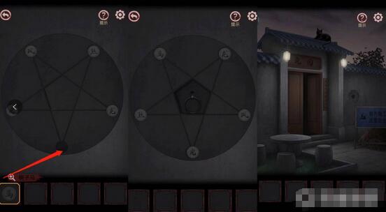3、最后在大门右边墙上有一个五星图,将之前得到的棋子马放入其中,再根据得到的线索移动棋子就能将大门打开。