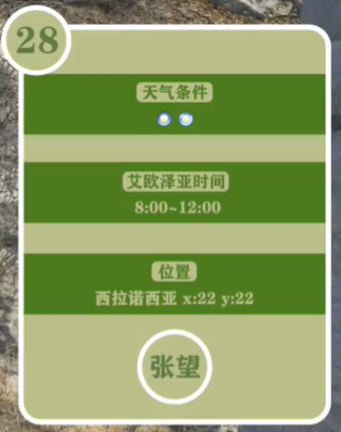 需要在晴朗天气的8:00-12:00来到西拉诺西亚的x:22,y:22位置。