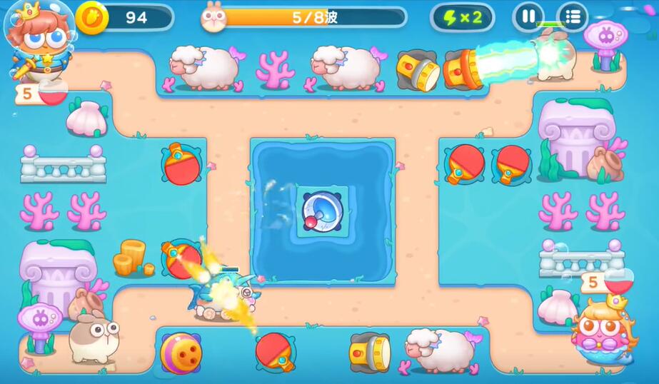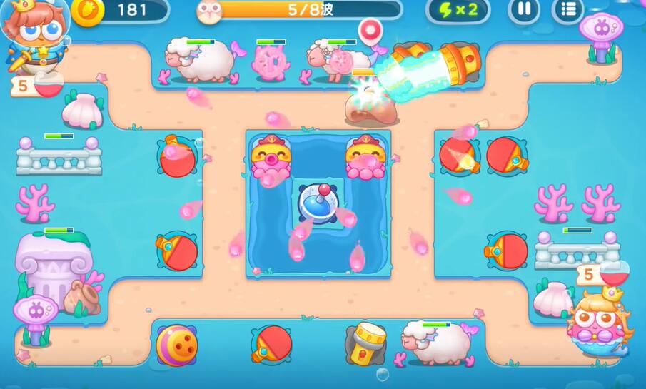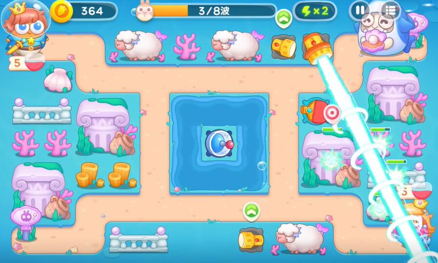 5、在中间下方建造激光塔,左侧右侧补充乒乓球,出现的兔子进行攻击。