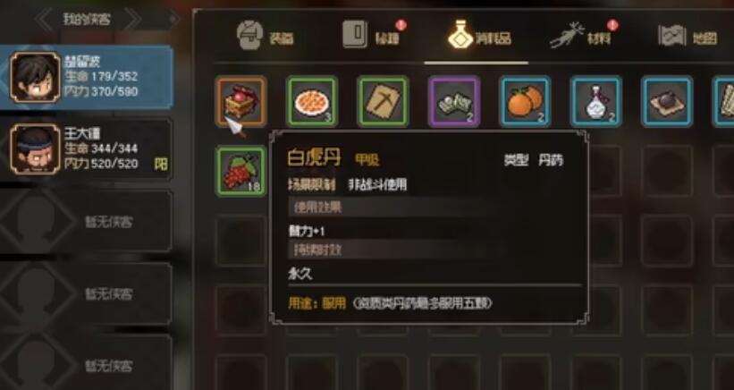 5、吃完饭后就会发现道长掉了一个白虎丹,可以永久增加一点臂力,先不要服用。