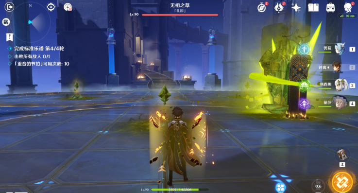 9、[重音的节拍]:所有角色的攻击力提升500点,同时场上每存在一个非枯焦状态的区域,队伍中角色攻击力提高50%,持续2秒。魔物为无相之草。