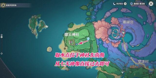 任务列表中可追踪取水点,在海祇岛的曚云神社,通过七天神像传送过去。