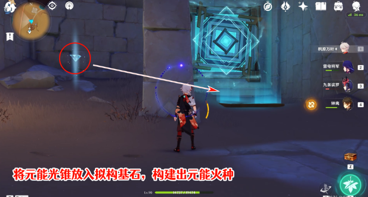 3、往里走到左手边的风扇处时,将这里的元能光锥带到拟构基石上,就可以复原出元能火种。