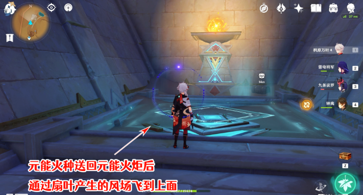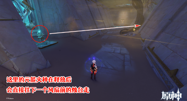 4、元能火种释放后,会直接往下个风扇前的元能烛台走,小心被下一个风扇吹散。(可以角色面对风扇走,有风的时会明显感受到阻力,当阻力消失时就直接释放火种,这样就可以卡在两边风扇停止的间隙将它送到下一个风扇前的烛台上了)