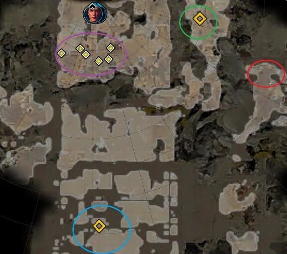 6、然后我们前往地图上红色的圈圈,这里是大德鲁伊的牢笼,蓝色的是女祭司,绿色的是明萨拉,紫色的是大地精。