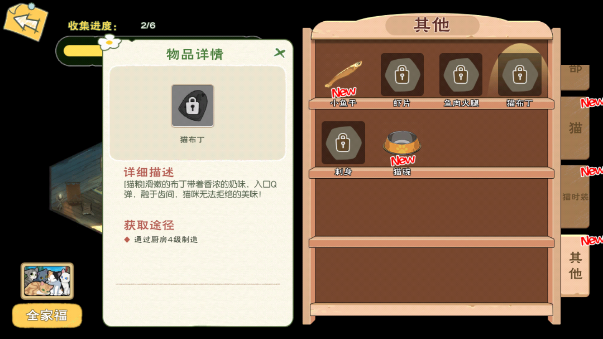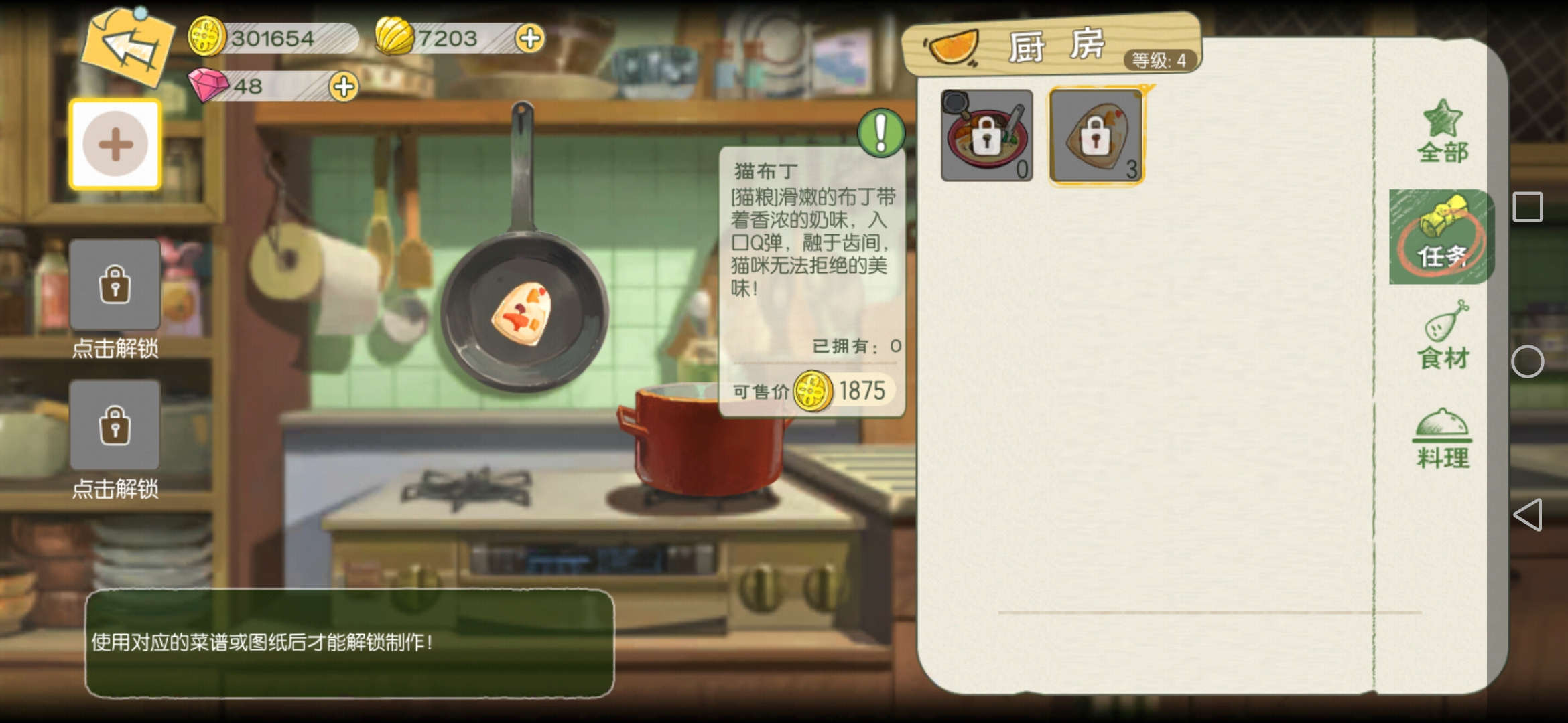 3、这个时候即可解锁猫布丁,而且要厨房到达四级。