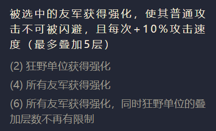 二狂野效果:在战斗开始的时候随机选中友军强化,被强化过的友军普攻敌人无法闪避并且每天攻击增加10%攻击速度。(如下图所示)