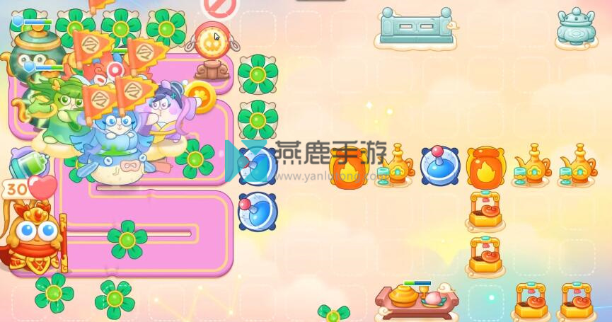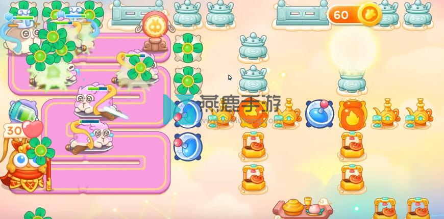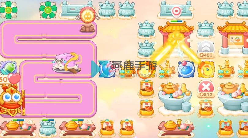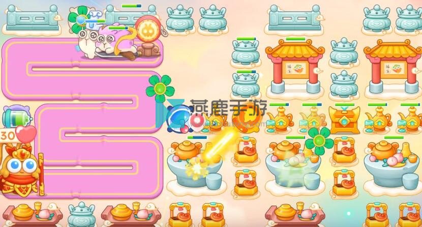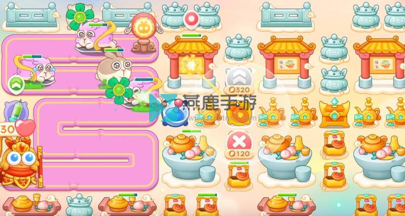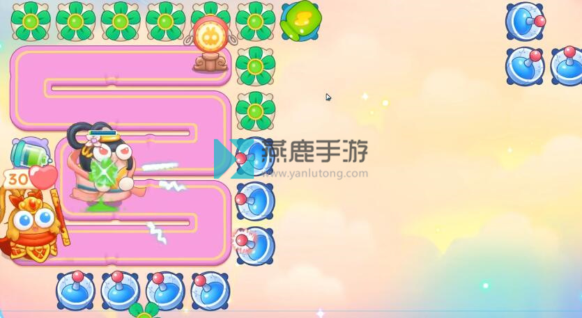 6、神仙来了,在左上买齐风扇,火炮是主力输出,遇到镜子和钉子都打掉,左边路边买雷达,除了打神仙技能,一直打神仙,遇到仙女兔锁定。