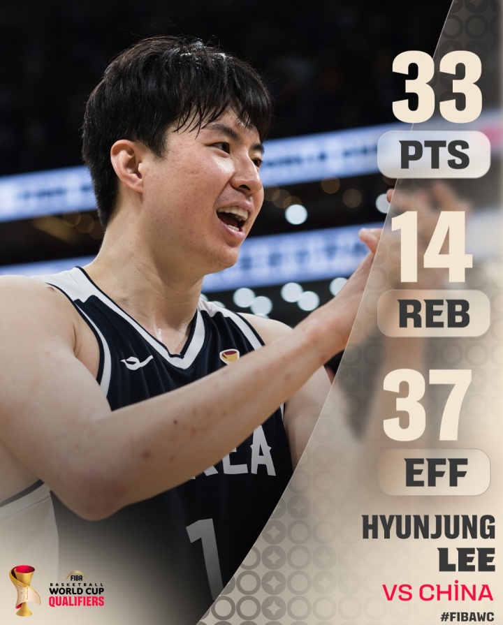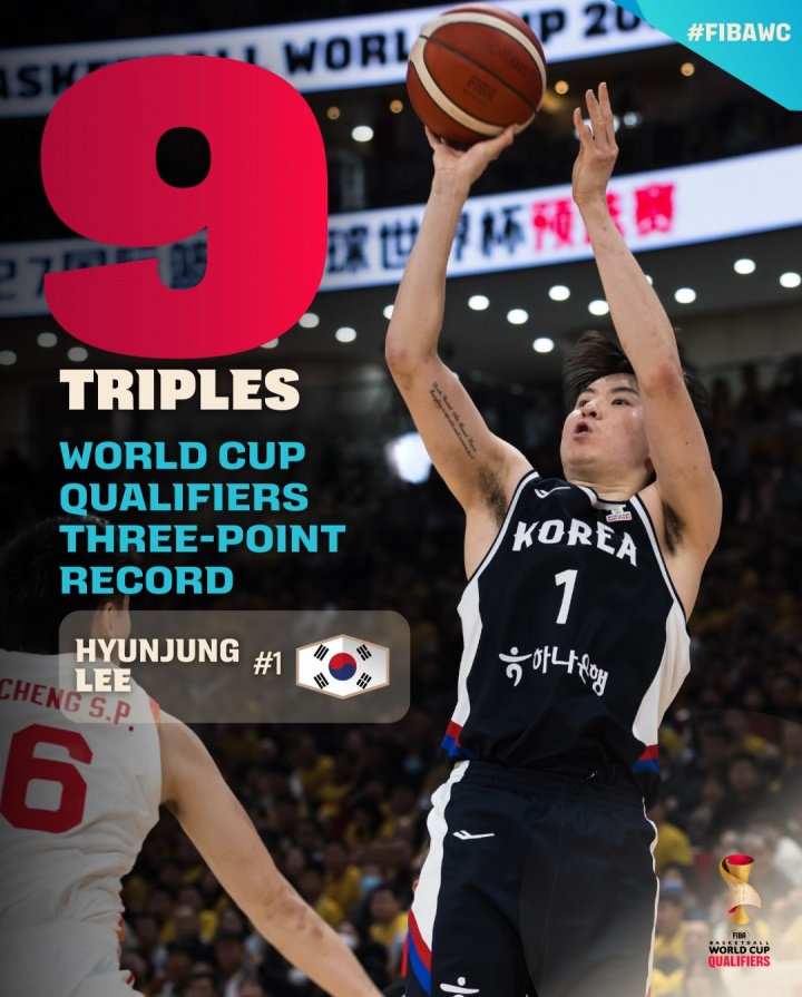 此役,韩国男篮核心李贤重投进9记三分,创造男篮世预赛单场最高纪录,此前是8记三分(一共有7人)。