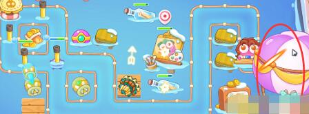 2、接着我们第一波可以按如图所示位置放置分裂弓开图,在交叉路放置水雷和鱼雷,热气球兔出来我们用手直接划开它。