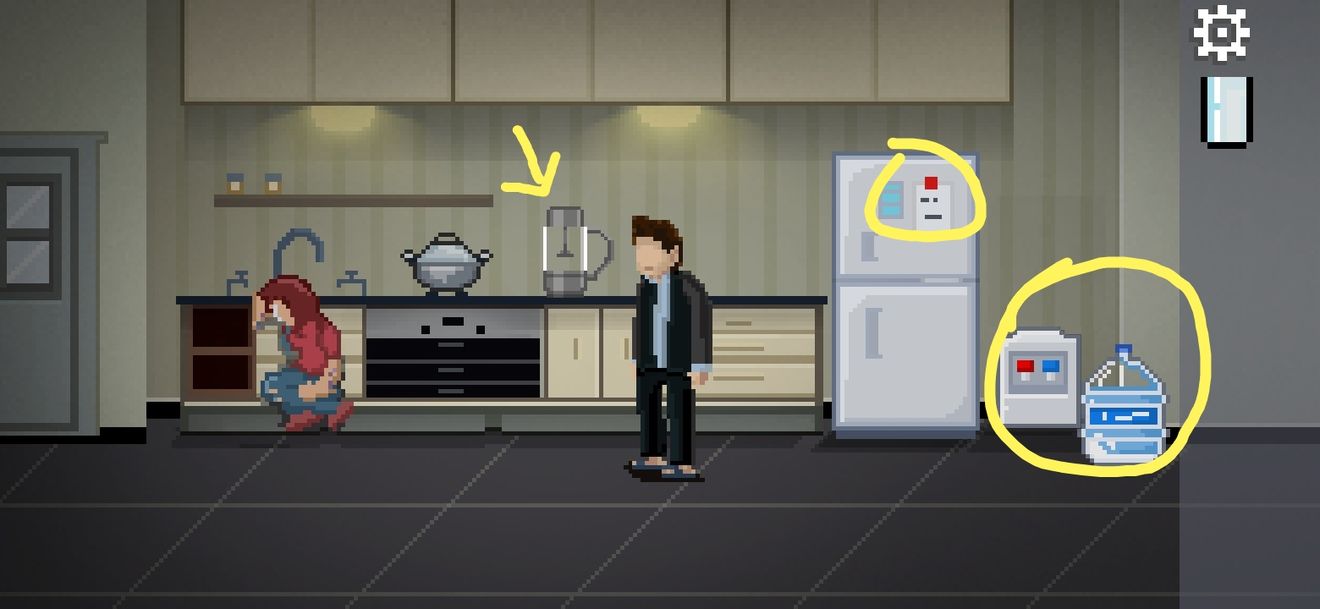 打开冰箱下层获得一个柠檬;点击水桶装饮水机,根据冰箱上贴的纸条提示的红蓝点击水龙头,打开后即可用玻璃杯装水。把柠檬和水分别装入榨汁机,拾取柠檬汁喂给妻子。