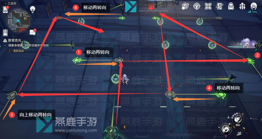 5、调整方向。第①顺时针4次。第②移动后,顺时针3次。第③逆时针3次。第④顺时针2次。