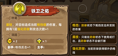 1、核心技能铁卫之佑,对目标造成当前格挡值的伤害,每拥有1层强化防御攻击次数+1。