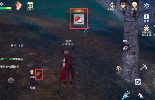 2、我们抵达该坐标位置即可找到苹果树后,在地上我们可以捡到苹果。