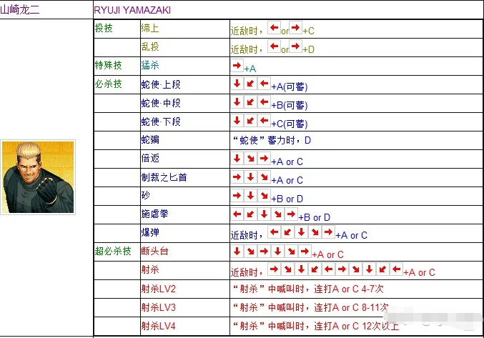 以上便是小编为大家带来的拳皇97山崎龙二出招表的所有内容了,希望可以帮助到大家更好的使用山崎龙二这个角色。