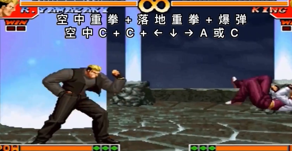 说明:5代表原点,2是原地下蹲、8是原地跳、4是后退、6是前走、1是后蹲、3是前蹲、7是后跳、9是前跳。A代表轻拳、B代表轻脚、C代表重拳、D代表重脚。像八神发慢波,就可以用236A,发快波就用236C键盘。