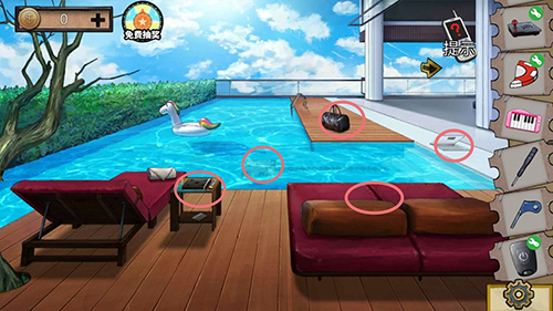 4、接着把骨头给狗狗得到半个发条,点击光头男和女士触发对话。进入左边泳池。