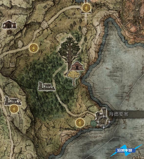 有一个比较快速到达的方法,在获得符节左的海德要塞上方有一处玛莉卡第三教堂,在教堂附近的河流,图上红标位置有一处传说门,点击传说门我们就会被传送到盖利德地区的最北部野兽神殿。从野兽神殿一直向南方前进,途径一所大桥后就会到达法洛斯要塞。