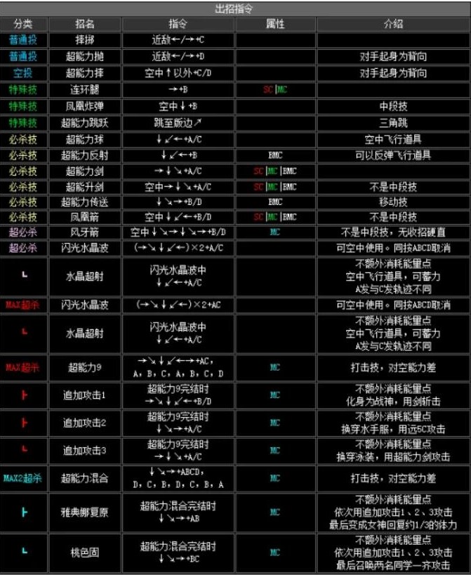 MAX超必杀技 超能力9 →↘↓↙←→+AC ·A·B·C·A·B·C·D