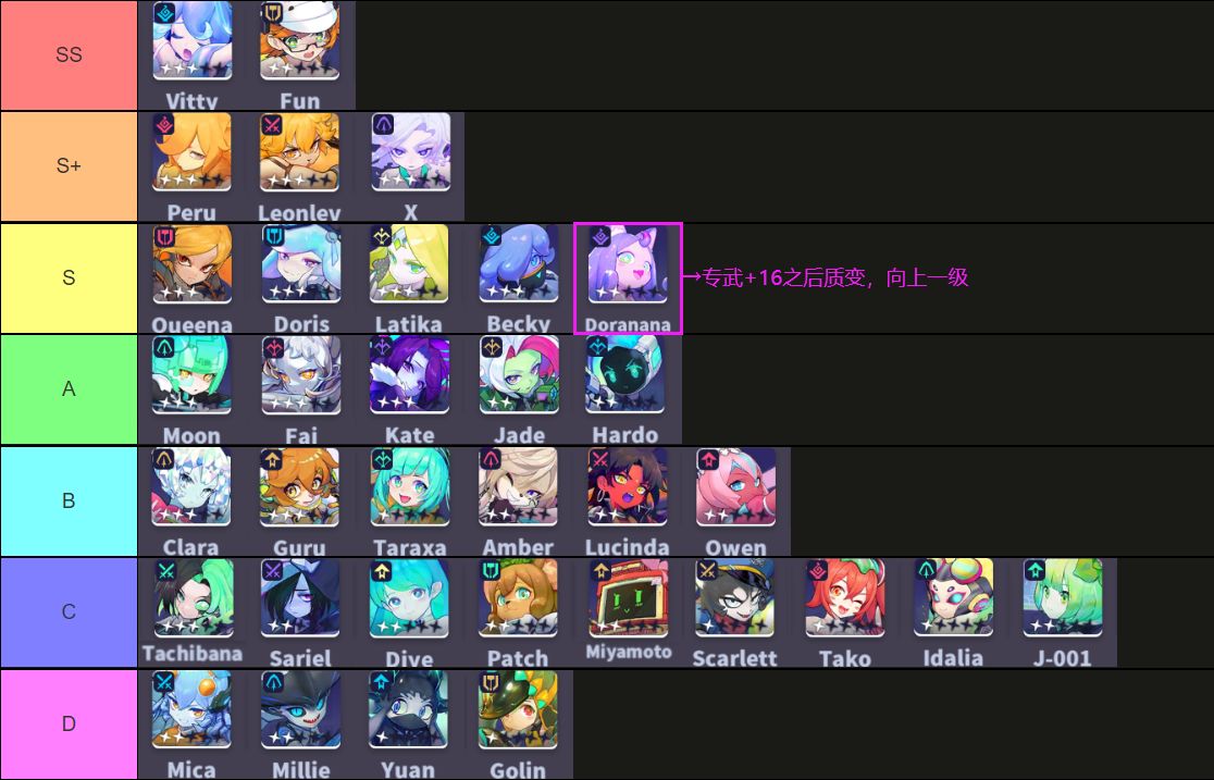 暗系可以用来补羁绊的刺客,但是输出也非常夸张,单切对面主c没有什么压力,大招还可以用来报名,她的天敌是佩璐但是削弱了,所以她更强了,但是专武技能有点拉胯。