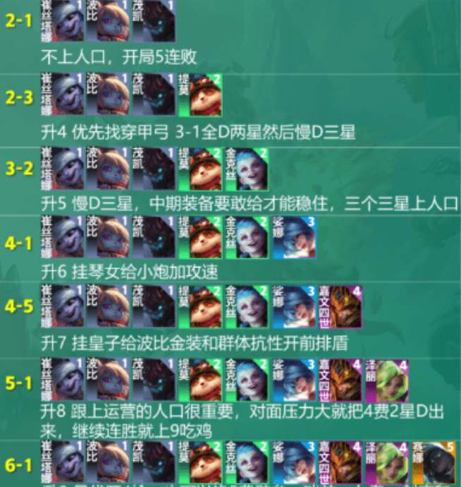 4、运营思路:小炮作为1费卡尽量前期就直接追3星,通过枪手羁绊来提升小炮的输出能力,约德尔人3个3星后小炮即可在战斗中达到4级并获得新的技能效果,进一步提升输出能力。