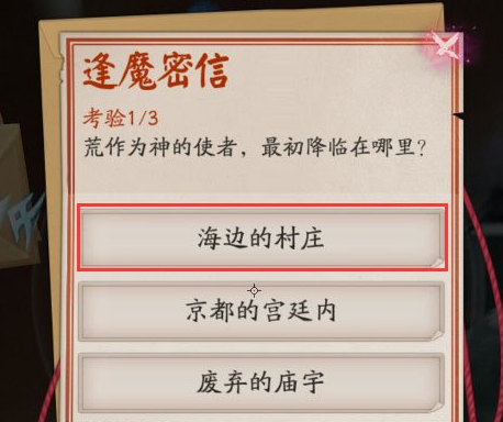 阴阳师逢魔密信中有这么一道考验:荒作为神的使者,最初降临在哪里?这道题考查了玩家对于荒背景故事的了解。