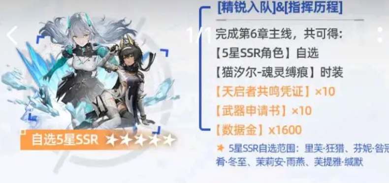 1、新手完成第六章主线后,可以解锁自选ssr福利。选择范围:里芙·狂猎、芬妮·咎冠、肴·冬至、茉莉安·雨燕、芙提亚·缄默。