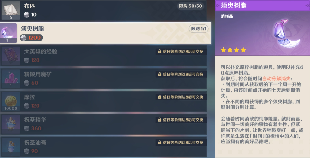 1、洞天商店别的摩拉、经验书等可以不换,须臾树脂一定要换;