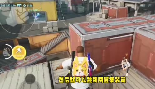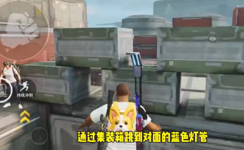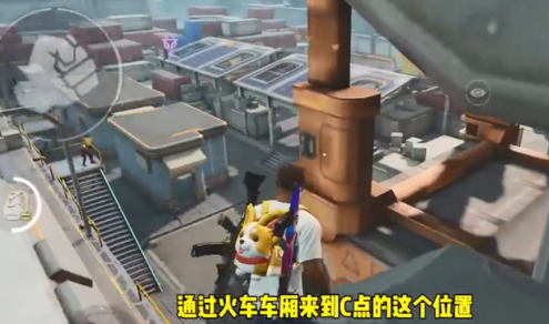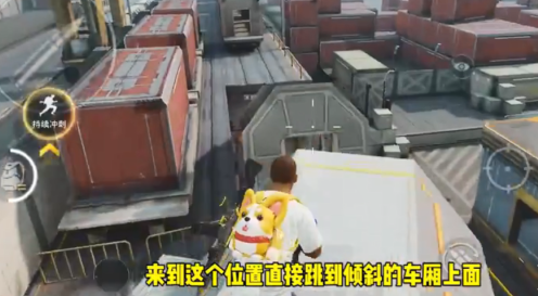 先到达c点位置,通过火车车厢看到一个黄色柱子,这里有一个可以站得平台,直接迅速冲过去爬到这个位置,如下图。