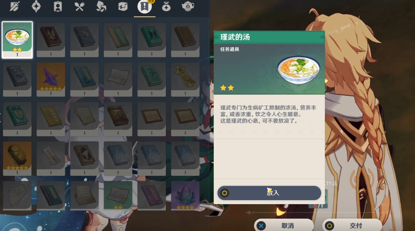 3、击败周围的怪物,自动传送回勘探队营地,与瑾武对话,拿汤给志琼。