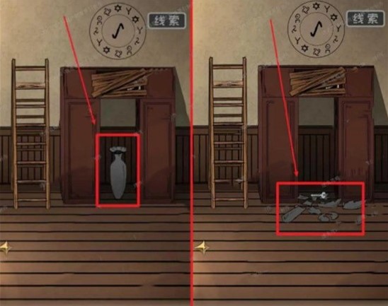 1、进入游戏之后先点击场景右边的箭头切换到右边的场景,在将场景切换过来之后会发现这里有一个花瓶,点击将其打碎,接着点击拿走花瓶碎片中的钥匙。