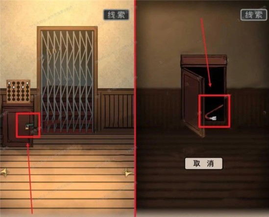 2、拿到钥匙之后向左移动一个场景,点击铁门旁边小柜子上的锁锁其打开,接着点击柜子放大,放大之后再点击柜子将其打开,点击拿走里面的撬棍。