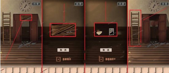 3、向右回到之前打碎花瓶的那个房间,点击柜子上的木板放大场景,接着点击木板将其打碎,拿走格子里的两件物品,最后再拿走柜子旁边的楼梯。下一段开始各位会发现我的物品栏里没有楼梯,这是因为我忘了拿,总之各位先拿上,用到的时候我自会讲解。