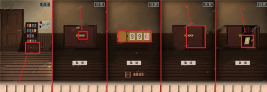 4、向左边移动2次,来到有书架的这个房间,点击书架下的小柜子放大场景,接着点击柜子上的密码锁,输入密码991(刚才在书架那里获得的其中一个线索)将密码锁打开,拿走里面的黄皮书。
